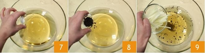 salez 7, ajoutez le poivre en grains 8 et versez dans la marinade les légumes coupés en lanières : le céleri 9,