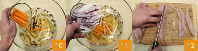 la carotte 10 et l'oignon 11, mélangez avec une cuillère en bois pour imprégner les ingrédients de saveur. Occupez-vous maintenant de la viande : coupez le blanc de poulet en bâtonnets épais d'environ 1,5 cm 12.