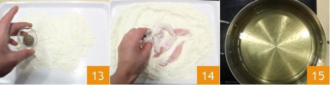Sur un plateau, disposez une couche de farine, salez, poivrez 13 et farinez les bâtonnets de poulet pour les recouvrir entièrement 14. Maintenant, mettez sur le feu une casserole à bords hauts adaptée à la friture, versez à l'intérieur l'huile de graines 15 et faites-la chauffer, elle devra atteindre une température d'environ 170°. Si vous n'avez pas de thermomètre de cuisine, pour vérifier la température de l'huile, émiettez un peu de farine dans la casserole avant de verser les ailes de poulet : si elle crépite, cela signifie que l'huile est suffisamment chaude pour la friture.