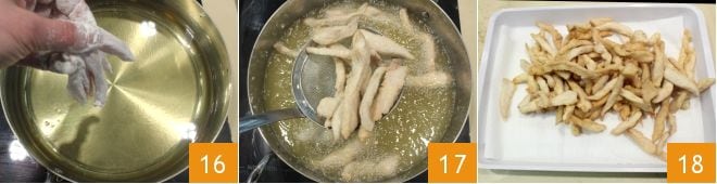 Faites frire les lanières de poulet, peu à la fois, pendant quelques minutes jusqu'à ce qu'elles soient légèrement dorées 16. Égouttez-les avec une écumoire 17 et mettez-les à sécher sur un plateau recouvert de papier absorbant 18.
