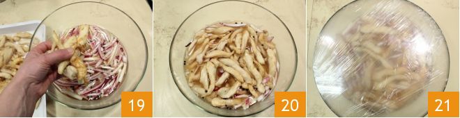 Laissez refroidir les bâtonnets de poulet puis plongez-les dans le carpione (19-20), couvrez le bol avec un film plastique 21. Laissez reposer une nuit puis servez à table dans le même récipient.
