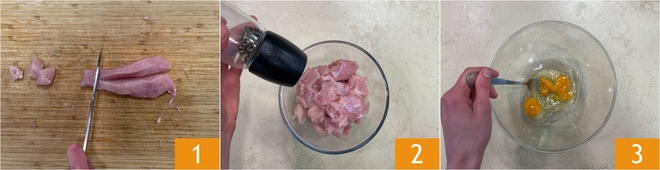 Pour préparer le poulet frit, commencez par couper le blanc de poulet en morceaux 1. Mettez les cubes de viande dans un bol, salez, poivrez 2 et réservez. Dans un autre bol, battez les œufs 3.