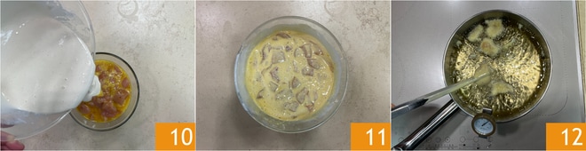 Versez la pâte dans le bol avec le poulet 10 et mélangez bien 11. Faites chauffer l'huile dans une poêle ou un wok et, quand elle est bien chaude, à environ 180°, plongez les morceaux de poulet 12.