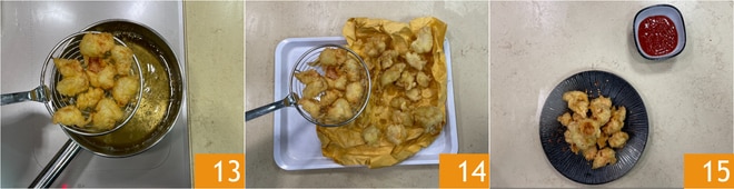 Laissez-les frire jusqu'à ce qu'ils soient dorés, puis égouttez-les 13 et placez-les sur un plateau recouvert de papier absorbant 14. Servez immédiatement le poulet frit bien chaud, accompagné de la sauce aigre-douce 15.