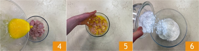 Ajoutez l'œuf battu 4, mélangez 5 et laissez mariner au réfrigérateur pendant environ une heure. Préparez la pâte : versez dans un autre bol la farine et la fécule 6.