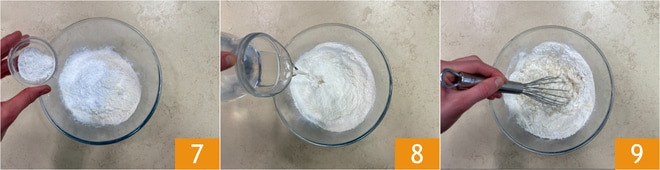 Ajoutez également la levure 7. Puis versez lentement l'eau froide 8 en remuant soigneusement avec le fouet 9 jusqu'à obtenir une crème lisse et sans grumeaux.