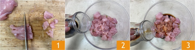 Pour préparer le poulet gong bao, commencez par couper le blanc de poulet d'abord en lanières puis en dés 1. Placez les dés de poulet dans un bol et assaisonnez avec du vin de riz 3 et de la sauce soja 3.