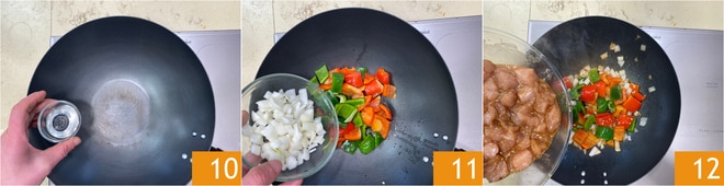 Chauffez un wok, puis versez un peu d'huile végétale 10 et ajoutez les légumes 11. Faites rapidement sauter les légumes en remuant, puis ajoutez le poulet 12.