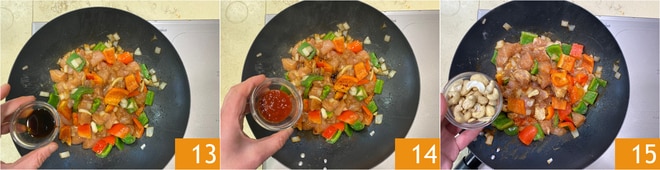 Mélangez et faites sauter à feu vif, puis déglacez avec de la sauce soja 13. Versez aussi la sauce piquante 14 et les cacahuètes 15.