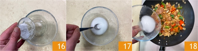 Dans un petit bol, versez l'eau et la fécule de pomme de terre 16, puis mélangez bien 17. Lorsque le poulet est bien cuit, versez le mélange dans le wok 18 et faites cuire encore quelques minutes.
