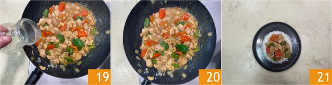 En fin de cuisson, un filet d'huile végétale pour donner de la brillance au plat 19. Votre poulet gong bao est prêt à être servi 20 accompagné de riz cuit à la vapeur 21 !