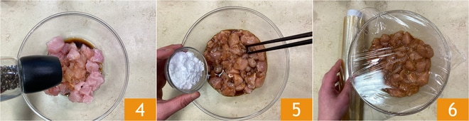 Assaisonnez avec du sel et du poivre 4, mélangez et ajoutez la fécule de pomme de terre 5. Mélangez à nouveau puis laissez reposer 30 minutes couvert d'un film plastique dans un endroit frais et sec 6.