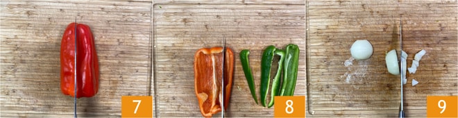 Prenez les poivrons et coupez-les d'abord en lamelles 7 8 puis en morceaux. Nettoyez et coupez l'oignon également en morceaux 9.