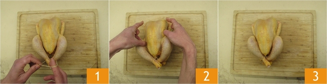 Pour préparer le poulet rôti, commencez par attacher le poulet afin qu'il garde sa forme après la cuisson. Prenez un élastique de cuisson au four, entourez la partie finale des cuisses 1, étirez-le et passez-le derrière la poitrine 2, afin de le maintenir en place 3.