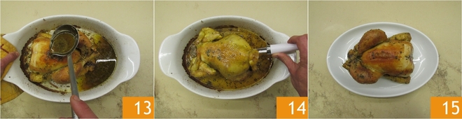 Faites cuire le poulet dans un four statique préchauffé à 180° pendant environ une heure. De temps en temps, arrosez le poulet avec son jus de cuisson 13. À mi-cuisson, sortez le poulet du four et retournez-le de l’autre côté 14, afin que la cuisson soit uniforme des deux côtés. Continuez la cuisson, en arrosant le poulet de temps en temps avec le jus. Une fois le temps de cuisson écoulé, sortez du four et servez votre poulet 15. Pour vous assurer qu'il est bien cuit, vous pouvez mesurer la température au centre de la cuisse, elle doit être de 72°.