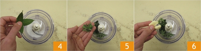 Mettez dans un mixeur le gros sel, ajoutez le laurier 4 et les autres herbes aromatiques : romarin, sauge et origan frais 5. Ajoutez aussi 2 gousses d'ail pelées 6.