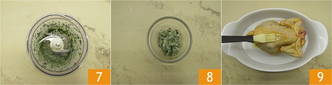 Mixez le tout 7 et transférez le mélange dans un petit bol 8. Prenez le poulet et placez-le dans un plat allant au four. Badigeonnez ou massez la surface du poulet des deux côtés avec de l'huile d'olive extra vierge 9.