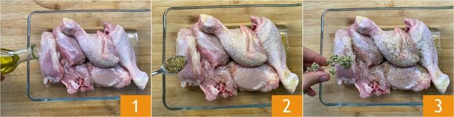 Pour réaliser le poulet rustique avec pommes de terre, commencez par mettre les cuisses et les hauts de cuisse de poulet dans un plat, puis assaisonnez avec de l'huile 1, du sel, de l'origan 2 et du thym séché 3.