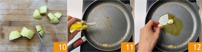 Entre-temps, épluchez les pommes de terre et coupez-les en gros cubes d'environ 3 cm 10. Dans la même poêle où vous avez cuit le poulet, versez un filet d'huile 11 et les gousses d'ail en chemise 12.