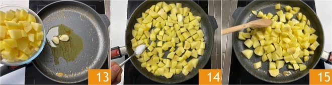 Ajoutez les pommes de terre 13, salez 14 et faites-les dorer à feu moyen pendant environ 15 minutes 15.