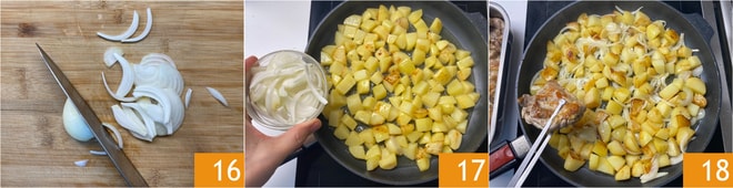 Entre-temps, épluchez et coupez l'oignon en tranches 16. Après 15 minutes, les pommes de terre seront colorées, retirez donc les gousses d'ail et ajoutez d'abord l'oignon 17 puis le poulet 18.
