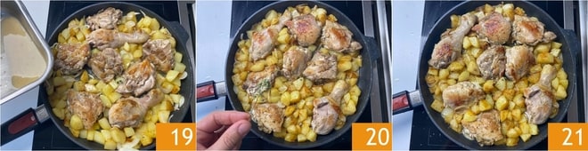 Versez également le jus de cuisson dans la poêle 19 et poursuivez la cuisson à feu moyen-doux pendant encore 10 minutes, en prenant soin de remuer délicatement pour ne pas casser les pommes de terre. Une fois cuit, parfumez avec de l'origan séché 20 et servez immédiatement votre poulet rustique avec pommes de terre 21!