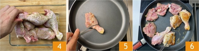 Massez la viande pour l'assaisonner uniformément 4. Disposez les morceaux de poulet dans une poêle antiadhésive déjà chaude 5 et laissez-les dorer à feu moyen pendant une dizaine de minutes, sans les toucher. Lorsqu'ils sont bien colorés d'un côté, retournez-les de l'autre côté 6.