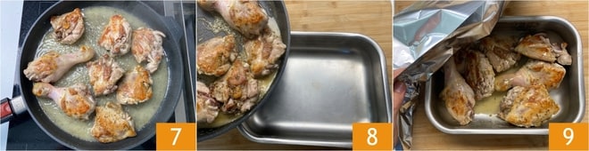 Après environ 5 minutes, déglacez avec du vin blanc et laissez cuire le poulet encore 10-15 minutes, toujours sans le toucher 7. Une fois ce temps écoulé, éteignez le feu et transférez le poulet dans un plat avec le jus de cuisson 8, puis couvrez avec une feuille d'aluminium pour éviter qu'il ne dessèche 9.