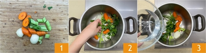 Pour préparer le poulpe à la cocotte-minute, commencez par éplucher l'oignon. Ensuite, coupez-le en morceaux, ainsi que les carottes et le céleri 1. Placez les légumes dans la cocotte-minute de 6L et ajoutez également le persil 2. Versez ensuite l'eau 3.