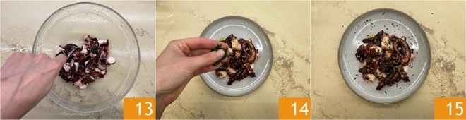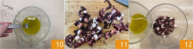 Versez l'huile et mélangez pour créer une émulsion 10. Lorsque le poulpe est tiède, transférez-le sur une planche à découper. Éliminez les entrailles présentes dans la tête, les yeux et le bec. Ensuite, coupez-le en morceaux 11. Transférez-le dans un bol et assaisonnez-le avec l'émulsion 12.