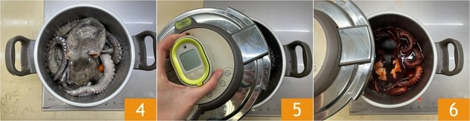 Placez le poulpe à l'intérieur 4 et fermez la cocotte avec le couvercle approprié 5. Allumez à feu moyen-élevé. Dès que vous entendez le sifflement, baissez légèrement le feu pour qu'il soit moyen et faites cuire le poulpe pendant 20 minutes. Une fois ce temps écoulé, éteignez le feu et faites évacuer la vapeur (en faisant toujours attention à ne pas vous brûler) avant d'ouvrir le couvercle 6. Maintenant, laissez le poulpe tiédir dans son eau de cuisson.