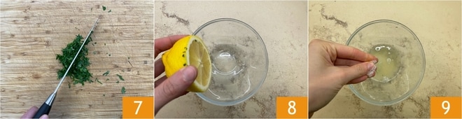 Entre-temps, préparez la citronnette pour l'assaisonnement. Tout d'abord, hachez finement le persil 7. Dans un petit bol, pressez ensuite le jus du citron 8 et ajoutez du sel 9 et du poivre.