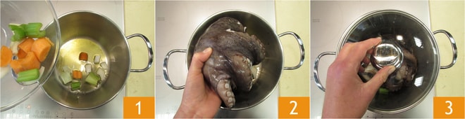Pour réaliser le poulpe à la plancha avec sa mayonnaise, vous aurez besoin d'un poulpe déjà nettoyé et éviscéré. Dans une grande casserole, versez les légumes grossièrement coupés : céleri, carotte et oignon 1. Ajoutez également le poulpe déjà éviscéré 2, couvrez avec un couvercle et laissez cuire à feu doux pendant 60 minutes 3.