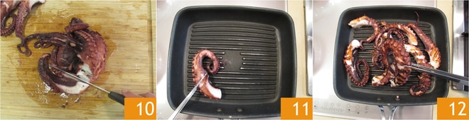 Chauffez la plancha, puis reprenez le poulpe désormais refroidi, coupez les tentacules 10 et disposez-les sur la plancha chaude 11, faites cuire environ 10 minutes et grillez bien. Ensuite, mettez de côté 12.
