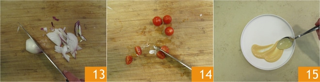 Nettoyez et coupez en fines tranches l'oignon nouveau 13, lavez et coupez les tomates cerises 14. Ensuite, vous pouvez dresser : mettez un peu de mayonnaise dans l'assiette 15
