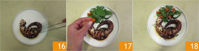 Déposez le poulpe sur sa mayonnaise 16, ajoutez l'accompagnement de salade verte, tomates cerises et oignon nouveau 17. Assaisonnez les tentacules avec du fenouil et du zeste de citron, assaisonnez la salade avec un filet d'huile d'olive extra vierge et votre plat est prêt 18 !