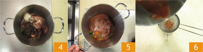 Une fois prêt 4, retirez le poulpe et placez-le sur une planche, laissez-le refroidir. Conservez 100 g d'eau de cuisson, filtrez-la et versez-la dans un verre haut 7 6.
