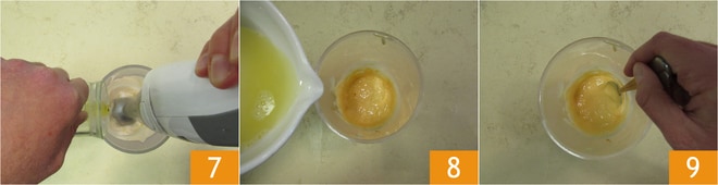 Pour réaliser la mayonnaise, commencez à émulsionner l'eau de cuisson 7, en ajoutant progressivement l'huile d'olive extra vierge en filet 8, jusqu'à obtenir la consistance lisse et épaisse souhaitée 9.