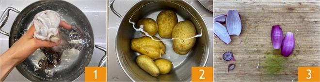 Pour préparer le poulpe, les pommes de terre et les oignons, faites bouillir une grande quantité d'eau dans une casserole. Rincez bien le poulpe sous l'eau courante. Immergez-le dans l'eau bouillante salée jusqu'aux tentacules, puis retirez-le, plusieurs fois pour le faire friser 1. Ensuite, immergez-le complètement et faites-le cuire pendant environ une heure (50 minutes peuvent suffire). Vérifiez la cuisson en perçant la partie près de la tête où les tentacules se rejoignent, avec une fourchette : si la fourchette entre facilement, le poulpe est prêt ! En attendant, faites également bouillir les pommes de terre avec la peau pendant 30-40 minutes, là aussi vérifiez la cuisson en les piquant avec une fourchette 2. Ensuite, pelez les oignons 3.