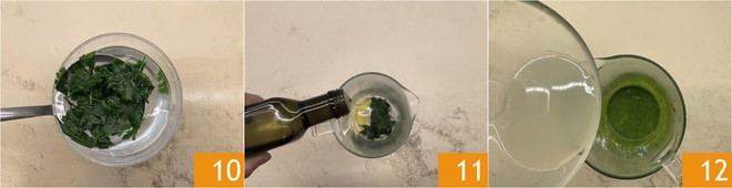 Égouttez, refroidissez en plongeant dans de l'eau froide (avec des glaçons si disponible), ainsi il conservera une belle couleur vive. Égouttez bien et versez dans le verre du mixeur plongeant, ajoutez de l'huile, mixez avec le mixeur plongeant 11, ajoutez le jus de citron 12, mixez à nouveau pour bien mélanger.