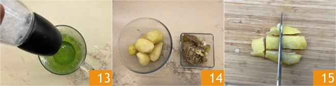 Ajustez le sel et réservez la sauce 13. Une fois que les pommes de terre sont cuites, pelez-les 14 et coupez-les en cubes d'environ 2 cm 15.