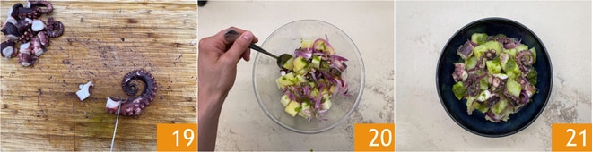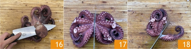 À ce stade, le poulpe sera également cuit : égouttez-le et laissez-le reposer une dizaine de minutes avant de le couper. Séparez la partie de la tête du corps du poulpe 16 et coupez-la en morceaux d'environ 2 cm, divisez le corps en deux 17 et retirez le bec. Retirez la partie avec les yeux. Séparez les tentacules un par un 18.