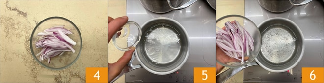 Émincez-les finement en julienne 4. Faites bouillir une petite casserole avec de l'eau, du sel et un peu de vinaigre 5. Versez les oignons 6.