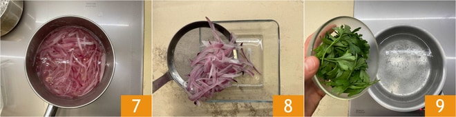 Faites cuire pendant une minute 7, puis égouttez 8 et réservez. Effeuillez le persil en retirant les tiges. Faites-le bouillir pendant quelques secondes dans l'eau 9.