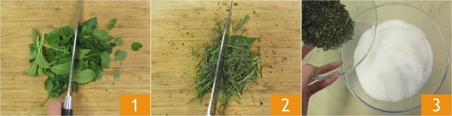 Pour préparer le poussin au sel, commencez par hacher les herbes aromatiques : d'abord la sauge avec le persil et la marjolaine 1, puis le romarin avec le thym et le laurier 2. Mélangez les herbes hachées avec le gros sel dans un grand bol 3.