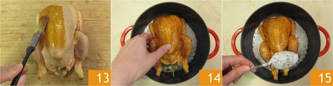 Badigeonnez le poussin avec l'huile au paprika, en couvrant bien toutes les parties 13. Maintenant, prenez une cocotte en fonte d'environ 21 cm de diamètre et couvrez le fond avec un peu de sel aromatisé, puis déposez le poussin farci 14 et recouvrez-le entièrement avec le sel restant 15.