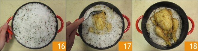 Faites cuire dans un four statique préchauffé à 200°C pendant 45 minutes 16. Une fois ce temps écoulé, sortez du four et laissez tiédir à température ambiante pendant au moins 30 minutes, après quoi vous pouvez retirer le sel avec une cuillère 17 et servir votre poussin au sel 18 !