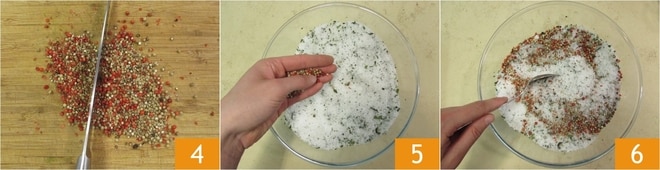 Hachez également les grains de poivre blanc et rose 4 et ajoutez-les au sel aromatisé 5, puis mélangez bien 6.