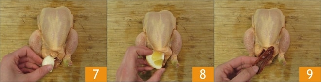 Passez à la farce : placez le poussin sur la planche à découper et insérez à l'intérieur les gousses d'ail 7, le citron 8 et les tomates séchées 9.