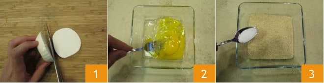 Pour préparer le primosale frit, commencez par le couper en tranches 1. Selon la taille du primosale que vous avez à disposition, vous pouvez choisir de faire des tranches ou des cubes. Cassez les œufs dans un petit bol et battez-les 2, puis versez la chapelure dans un autre bol et assaisonnez-la d'une pincée de sel 3. Enfin, mettez la farine dans un troisième bol. Placez une casserole avec de l'huile sur le feu et chauffez-la jusqu'à atteindre une température de 165°.